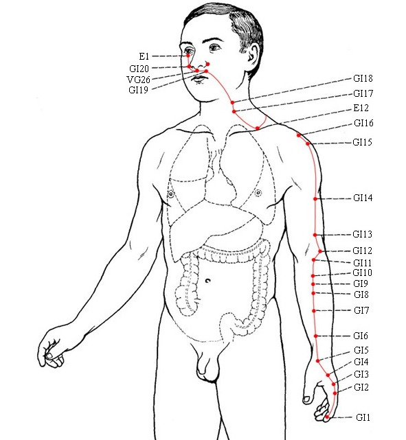 Легкие и дыхательные пути (инь): толстый кишечник является спаренным органом-мастерской ян для них. Воспаление носоглотки всегда связано с состоянием толстого кишечника и лечится особенно через Источник толстого кишечника, т. Хэ-гу (GI4).
