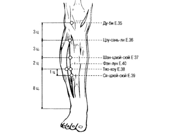 Точка Е40 фзн-лун: Расположена на 8 цуней выше вершины латеральной лодыжки, на 1 цунь кнаружи от точки Тяо-коу Е.38, на два поперечных пальца латеральнее гребня большеберцовой кости.