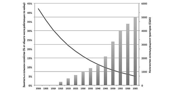 Весьма показательна обратная корреляция между числом тракторов в сельском хозяйстве США и долей, которую работники американских ферм составляли в общем числе работавших американцев в 1900–1960 годах. В 1900 году на сельское хозяйство приходилось 42 % от общего числа занятых, а в 1970 году – менее 5 %. То есть механизация труда самым непосредственным образом влияет на структуру занятости – это наглядно показано на рисунке 1.5.