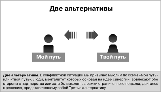 Те, кто мыслит меж двух альтернатив, зачастую попросту не воспринимают других как личности, поскольку обращают внимание лишь на их идеологию. Они не ценят иные точки зрения, поэтому даже не пытаются их понять. Внешне «двухальтернативщики» могут демонстрировать уважение к собеседнику, однако в действительности не слушают его, их цель – манипулировать им. Они всегда нападают, поскольку не чувствуют внутренней уверенности: на кону их территория, их «Я-идеал», сама их идентичность. В конечном счете, стратегия этих людей в отношении других – «выявить и уничтожить». Для них один плюс один равно нулю или того меньше. Какая уж тут синергия!