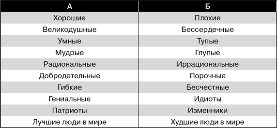 Возможно, вы уже сомневаетесь, со всяким ли человеком можно достичь синергии. Это может быть очень трудно в отношениях с людьми, умственно или эмоционально ограниченными, не умеющими владеть собой. Разумеется, невозможна синергия с психопатом. Но в большинстве своем люди – это просто люди. У мышления меж двух альтернатив есть скрытая проблема – коварная ловушка, в которую все мы, обычные рациональные люди, то и дело попадаем. Ее иллюстрирует рисунок: «Люди с моей стороны [выберите характеристики из столбца А]. Люди с твоей стороны [выберите характеристики из столбца Б]».