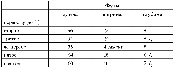 Футы длина ширина глубина первое судно [1] второе 96 25 8 третие 94 24 8 1/2 четвертое 75 4 сажени 8 пятое 64 18 6 1/2 шестое 60 16 7 1/2
