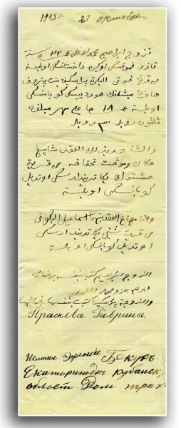 Заключили брак Ибрагим Мухаммед, 22 лет от роду, из Дагестана из аула Хуты, на Праскеве, дочери Петра Гаврина из Кубанской области, 18 лет.