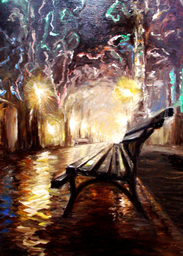 Уже стемнело, в парке зажглись фонари. Листья шуршали под ногами, отдавая последнюю дань рыжей осени.