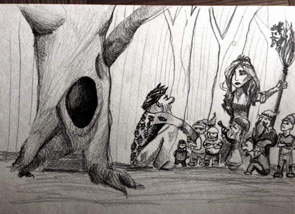 Но воинственные девочки-гномы были удивлены подобным себе не меньше. Они окружили их и удивленно разглядывали. Одна из них, наверно главная в их компании случайно подняла голову вверх и присела на землю от неожиданности. Леся! Хозяйка леса! -прошептала она. Другая девочка гном тут же подбежала к ней и указала пальцем в сторону Лешего. Та закрыла ладошками глаза и просто взвизгнула: Ой! Дедушка Леший!