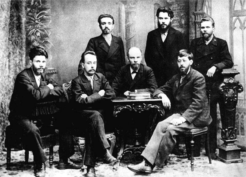 Члены петербургского «Союза борьбы за освобождение рабочего класса». Слева направо (стоят): А. Л. Малченко, П. К. Запорожец, А. А. Ванеев; слева направо (сидят): В. В. Старков, Г. М. Кржижановский, В. И. Ульянов, Ю. О. Мартов. Санкт-Петербург, 1897 г.