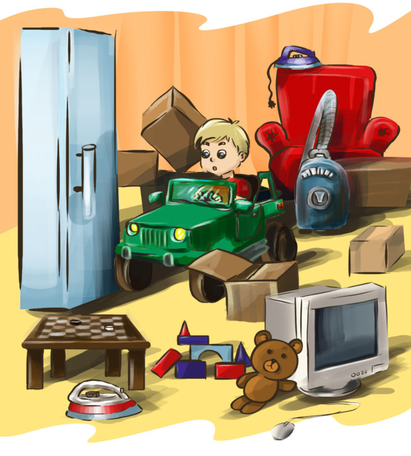 В это время послышался грохот – это Мама пробиралась к Папе, по дороге роняя кухонный комбайн, гараж для машинок, набор самих машинок, лежак для Боньки, коробку с пятью утюгами, пылесос, железную дорогу, плюшевого мишку и многое-многое другое.