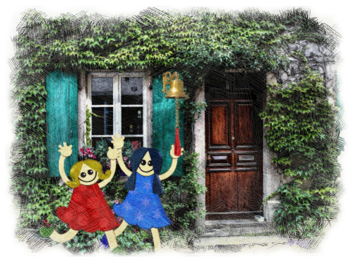 Стену двухэтажного дома оплетала разросшаяся лиана. Девочки подошли ко входу, над дверью которого вывеска с правильными буквами приглашала, – «Добро пожаловать!» На состаренной временем двери висела табличка, – «Вход», а жирная чёрного цвета стрелка в форме молнии указывала на дверную ручку. Над головой был подвешен колокольчик, величиной с ладошку, на язычке которого болталась алая лента. Переминаясь с ноги на ногу, они в нерешительности дёрнули за ленточку. Колокольчик молчал. Затем осмелев, они дёрнули за ленту посильнее, чтобы поскорее узнать, что за этой дверью. По округе разнёсся мелодичный звон.