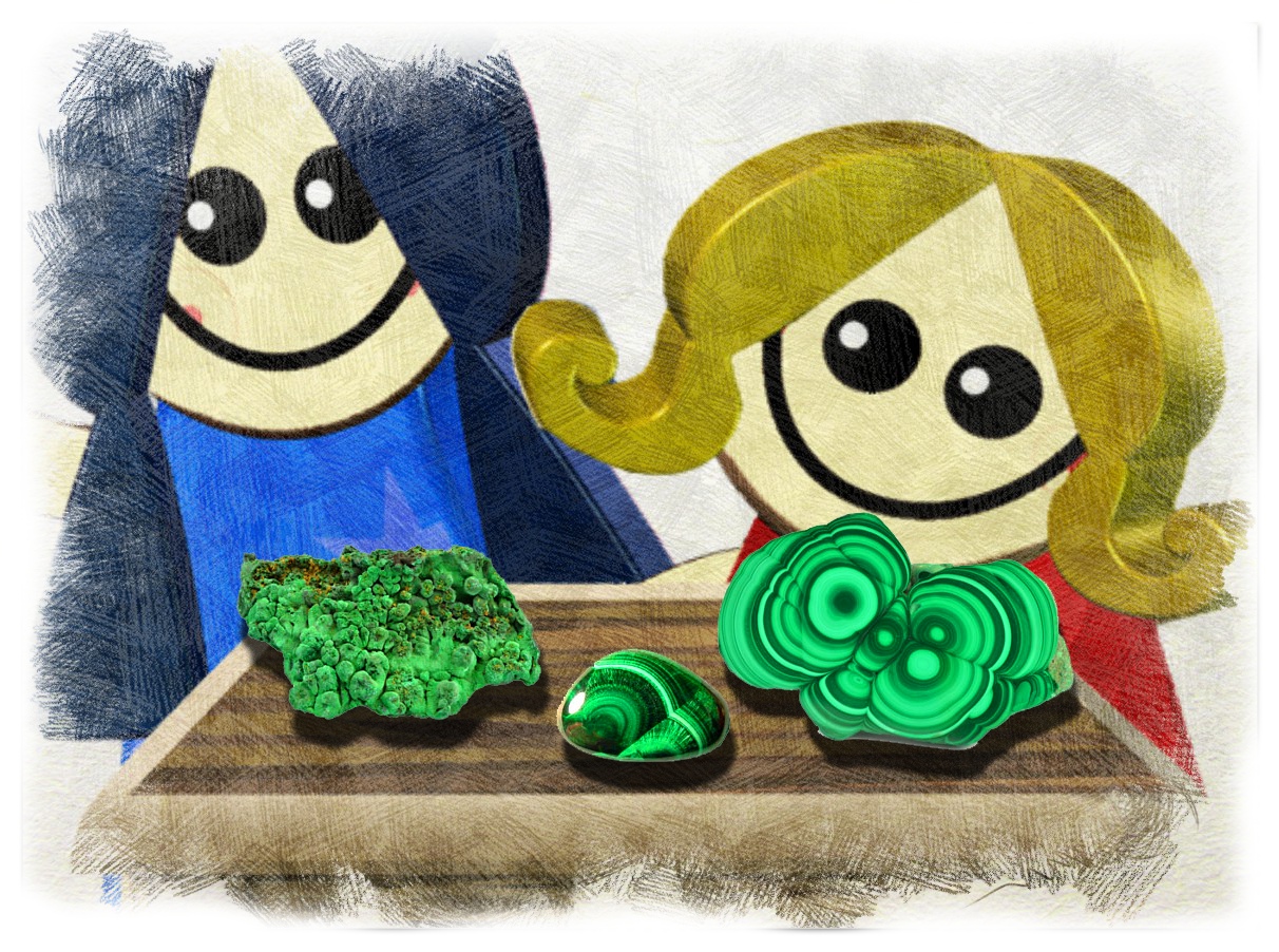 Любуясь содержимым витрин, подруги рассматривали разноцветные камни и сказочного вида минералы. Девочки, затаив дыхание, изучали гладкую поверхность малахитов. Им нравились отшлифованные до блеска картины природного художника, их удивило разнообразие оттенков зелёного на полотне мастера.