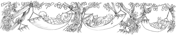 Лили уложила во второй гамак полосатого котёнка, крошечную выдру, крота и трёх мышат. Их никак не удавалось угомонить, потому что непослушный крот то и дело забирался под одеяло и щекотал всем задние лапки.