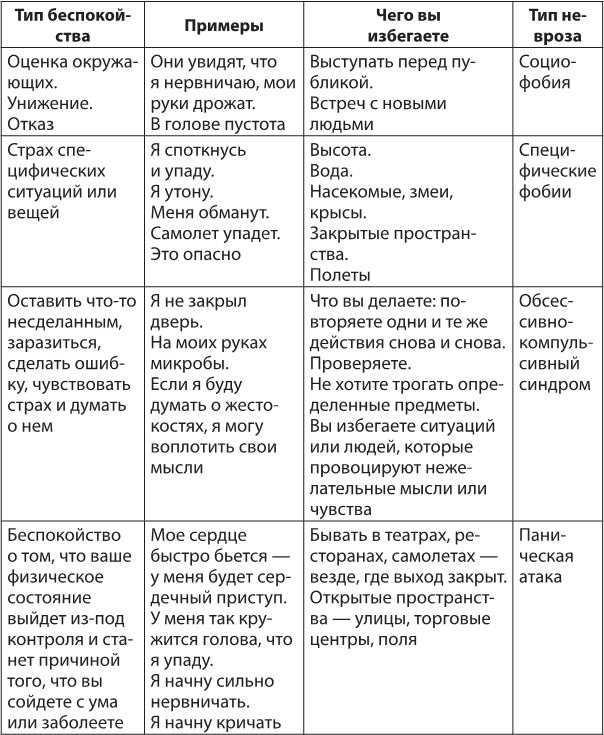 Взгляните на различные виды беспокойств и тревожных расстройств в табл. 1.1 и выясните, соответствует ли какой-нибудь из них вашим проблемам. Вероятно, вы найдете нужный тип.
