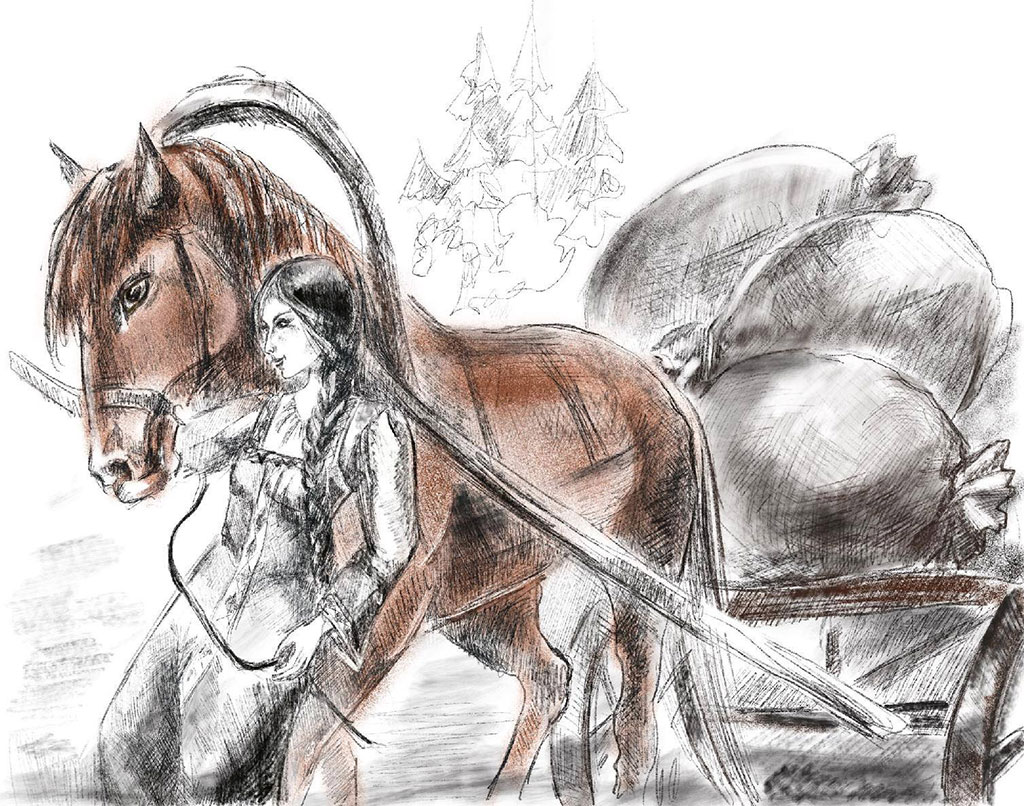 – Что кричишь?! Я не глухой, телега твоя так скрипит, за версту слышно, того гляди развалится, починить её надо, – отвечал мельник, появляясь из-за дома. – А ты что, дурная твоя голова, ночь уж скоро, а ты только едешь?! Я-то свою работу сделаю, не боись, только ты вот как домой в темноте поедешь? Мало ли зверья ходит…