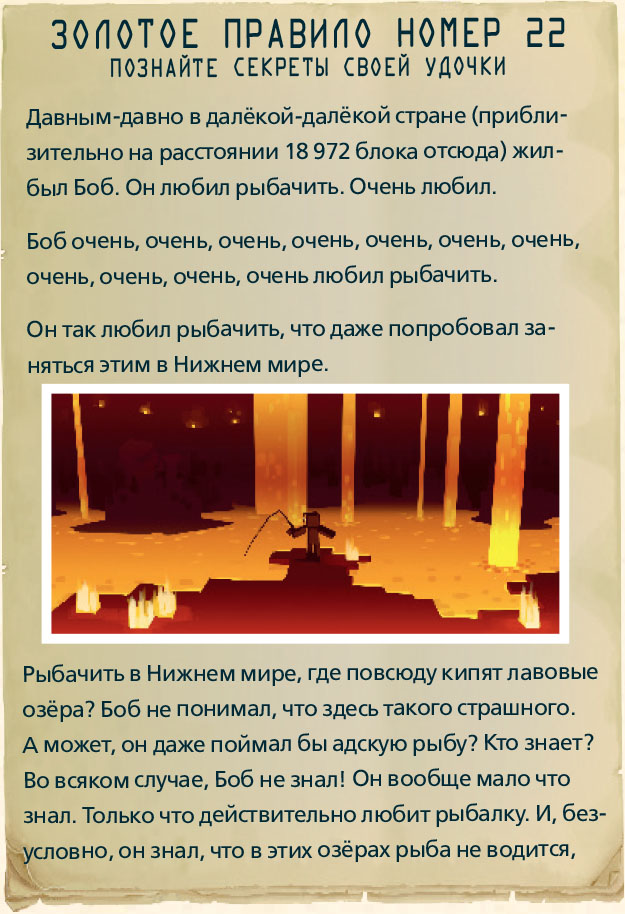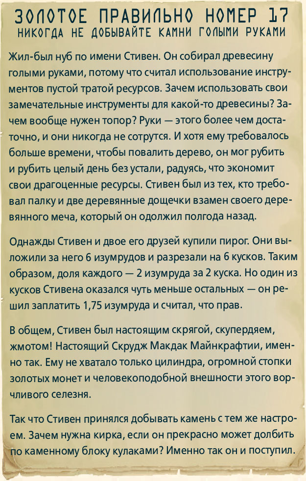 Его свод правил – это сборник самых нубовских советов в мире. Но все ученики обязаны его прочитать. Старейшины думают, что в нём суперважная инфа. Вот несколько примеров (каждое золотое правило – это маленькая басня, в которой есть сокровенный смысл – специально для нас):