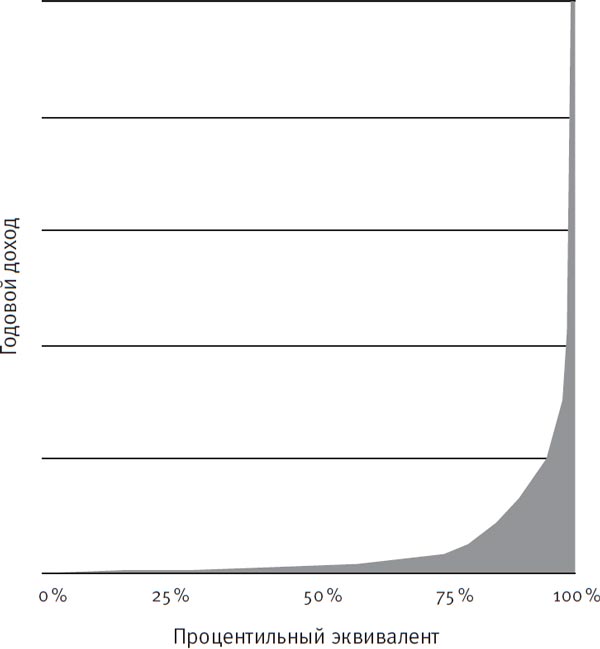 Здесь интервал 0–25 % представляет 25 % населения планеты с минимальными доходами, а 75–100 % – 25 % богатейшего населения. Если бы доходы у всех были одинаковыми, то под линией образовался бы прямоугольник. Но беднейшее население едва представлено на графике. На верхних 10 % кривая резко уходит вверх. А если я показал бы на графике 1 % самых богатых, страница получилась бы высотой с 23-этажное здание (выше первого Годзиллы[40]).