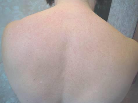 Рис. 2.02. Пациентка, 55 лет. Состояние спустя 2 часа от начала приставки, кожные покровы: а – задней поверхности шеи; b – верхней части спины; с – передней брюшной стенки (фото 23.03.2011 23:53–54)