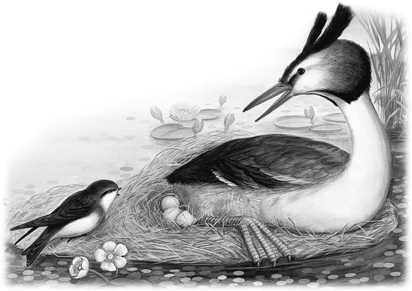 Тут Пеночка с Береговушкой простилась и наказала ей к этой рогатой птице ночевать попроситься. Полетела Береговушка и села на островок. Сидит и удивляется: островок-то, оказывается, плавучий. Плывёт по озеру куча сухого тростника. Посреди кучи – ямка, а дно ямки мягкой болотной травой устлано. На траве лежат Чомгины яйца, прикрытые лёгкими сухими тростиночками. А сама Чомга рогатая сидит на островке с краешка, разъезжает на своём судёнышке по озеру. Береговушка попросилась ночевать.