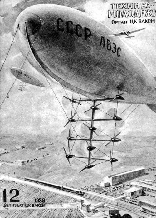 В статье П. Дюжева описывался другой тип дирижабля-ветродвигателя. Выполнив задачу по перевозке пассажиров и грузов, воздушное судно поднималось бы на высоту в 600 м, где удерживалось бы стальными тросами. Там «на оболочке его раскрываются лопасти, идущие в несколько рядов», и корпус «становится мощным колесом ветродвигателя»[45]. Данные идеи применения дирижаблей так и остались фантастическими.