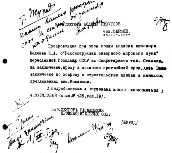 В начале 1930-х годов, видимо, ощущая актуальность задачи, энтузиасты-инженеры и проектировщики разработали и прислали на имя И. В. Сталина предложения по развитию водных транспортных коридоров; в дальнейшем эти предложения отправили на рецензию в Госплан СССР и отложили в архив экономики (РГАЭ, бывший ЦГАНХ)[53].