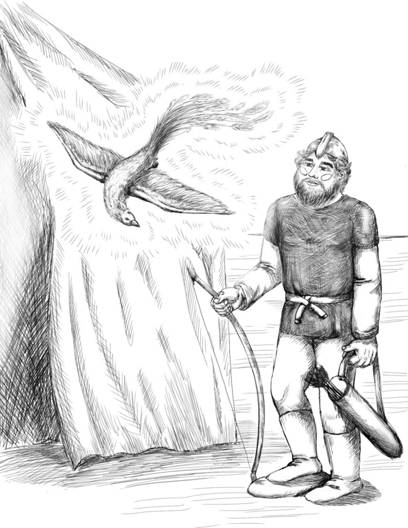 В ту пору Фёдор осаждал вражью крепость. Вышел он из боевой своей палатки, а стрела золотая обернулась птицей с золотыми перьями и кружит над ним. Хотел Фёдор птицу ту подстрелить. А она его спрашивает: