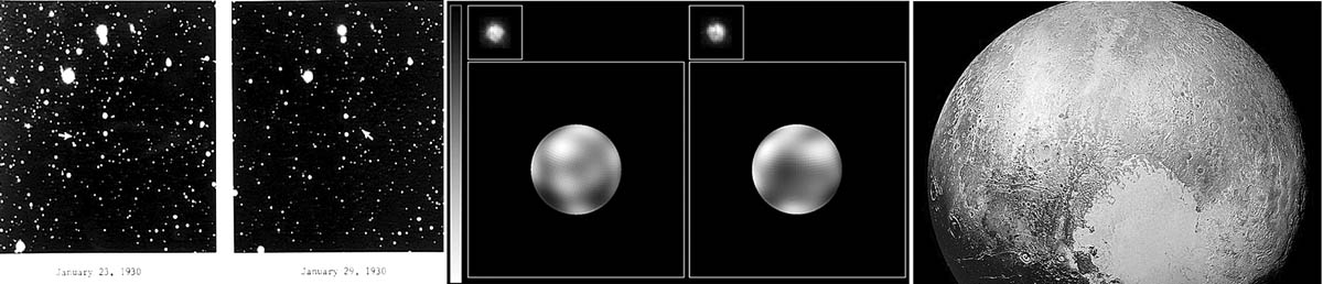 1. Фотографии звездного неба, по которым в 1930 американским астрономом Клайдом Томбо был открыт Плутон. Положение Плутона показано белой стрелкой. (Обсерватория Лоуэлла, 23 и 29 января 1930).