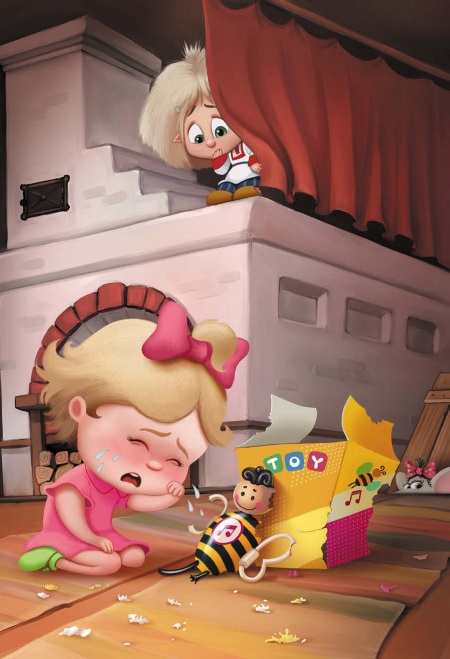 Мохнатик от любопытства не знал, куда себя деть. Всё ходил вокруг да около кроватки, пытался в неё заглянуть. Ему ничего не было видно. Он залез на подоконник, но и оттуда никак не мог рассмотреть, что же там, в свёртке, лежит. Новая вещь не давала ему покоя! Он обо всём должен узнавать первым! Мохнатик решил во что бы то ни стало попасть в кроватку и посмотреть, что же там лежит. Он вскарабкался по занавеске, раскачался на ней и у-у-ух! – занавеска оборвалась, и вместо того, чтобы оказаться в кроватке, домовёнок рухнул на маленький столик около неё и сильно ударился.