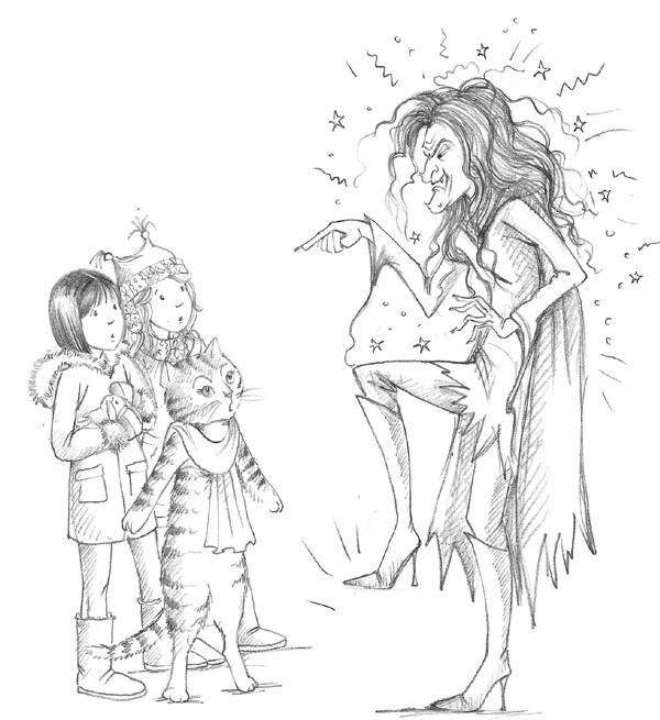 – Ха! – хохотнула Гризельда. – Вредные девчонки и глупая кошка, вечно суёте нос куда не следует! Надеетесь мне помешать? – Она разразилась смехом. – Как бы не так! У меня трое новых слуг, и вместе мы превратим ваш жалкий Студёный фестиваль в бесконечную, морозную, жестокую зиму! Ни сластей на деревьях! Ни милых подарочков! Только сугробы, сплошные сугробы!