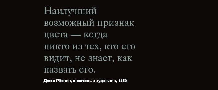 Выходившая после этого литература, посвященная взаимосвязям языка, цвета и культуры, раздражающе неоднозначна. Один лагерь – релятивисты – утверждает, что язык влияет на восприятие и даже формирует его и что без соответствующего лексического обозначения цвета мы просто не увидим его, не отличая от других. Универсалисты, следуя Берлину и Кею, уверены, что основополагающие цветовые категории едины для всех и каким-то образом заложены в биологию человека. Единственное, что мы можем сказать наверняка, – язык цвета очень непрост. Дети, легко отличающие треугольник от квадрата, могут не увидеть разницу между розовым, красным и оранжевым. Известно, что отсутствие слова для обозначения чего-либо не означает, что мы неспособны это «что-то» распознать. Греки, конечно, прекрасно различали цвета, возможно, они просто не считали их такими же интересными, как мы.