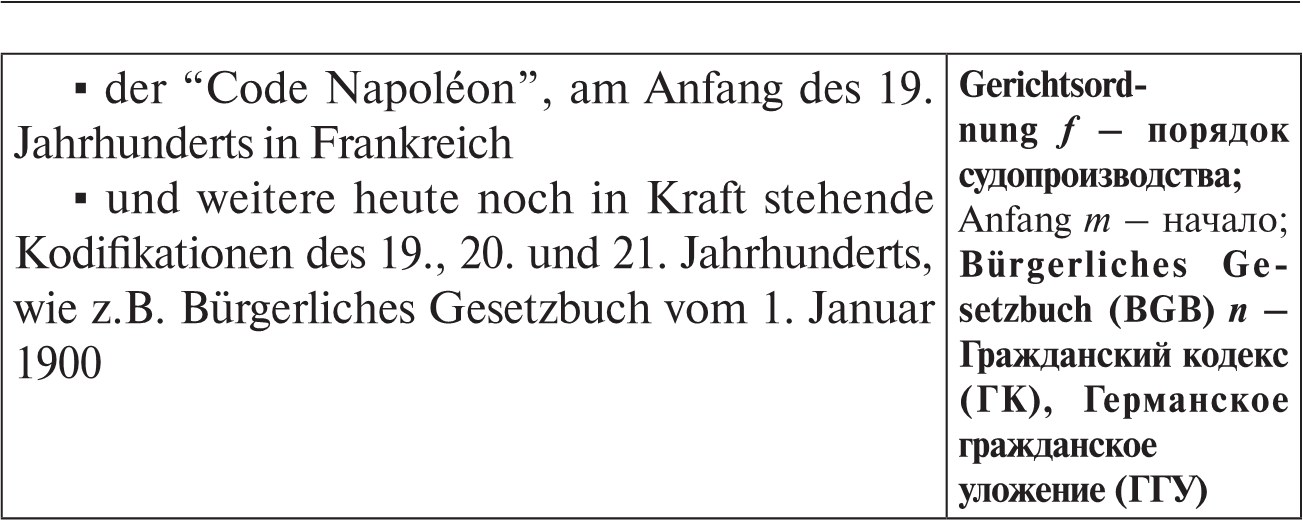 Grundgesetz (GG) n – Основной закон (название конституции ФРГ); Bundes-Verfassungsgesetz (B-VG) n ≈ Конституция Австрии; Bürgerliches Gesetzbuch (BGB) n – Гражданский кодекс ФРГ, Германское гражданское уложение (ГГУ); Allgemeines Bürgerliches Gesetzbuch (ABGB) n – Гражданский кодекс Австрии, Австрийское гражданское уложение; Zivilprozessordnung (ZPO) f – гражданский процессуальный кодекс; Strafgesetzbuch (StGB) n – уголовный кодекс; Strafprozessordnung (StPO) f – уголовно-процессуальный кодекс;