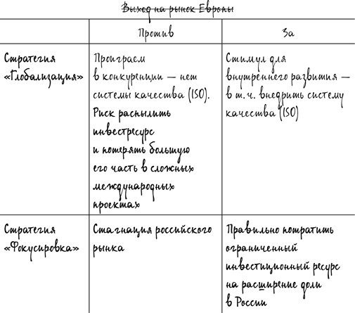 Фасилитатор. Я вижу, что наш разговор выходит на более концептуальный, стратегический уровень. Константин и Иван поднимают вопрос не только о том, пробовать ли продавать в Европе, они спорят о географической стратегии в целом. Константин предлагает стратегию, которую можно назвать «глобализацией», и выдвигает важный аргумент за нее: стагнация российского рынка. А Иван