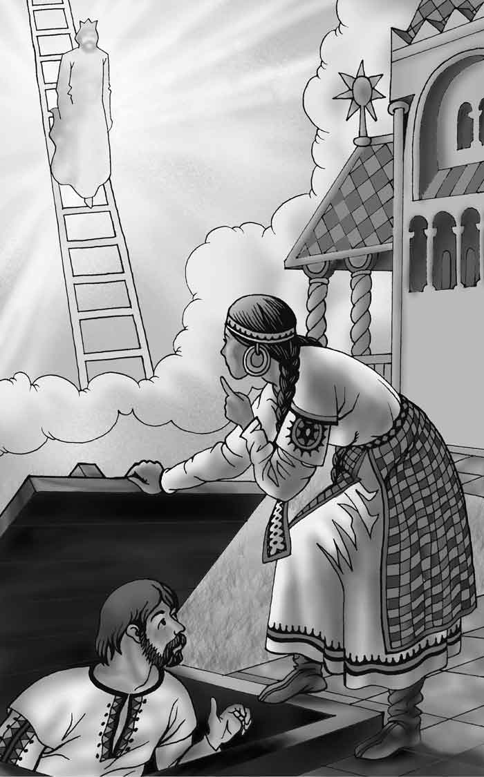 Взяла та й пустила його в льох. Тільки-но вона повернулась до хати, аж з’являється додому Сонце. Скинуло свої шати, повісило їх на погрібнику і також заходить до хати. Сестра питає:
