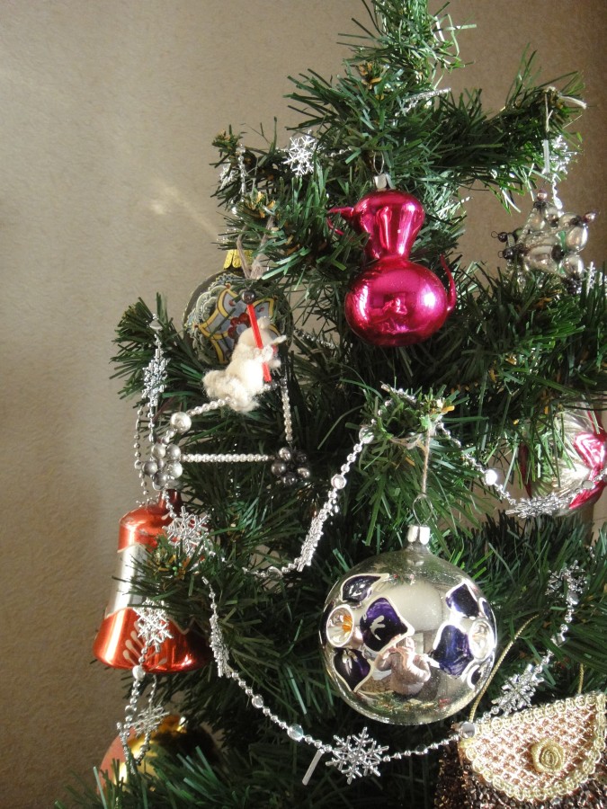 Не люблю стильных елок! Однотонные шарики одного и того же цвета и размера, того же цвета одинаковые бантики из шелковой ленты одной и той же ширины – напоминает магазин, в котором сотрудники, наряжая к Новому году елку, повесили на нее одинаковые игрушки, которые у них никто не купил. Нет, в пестрой и разнообразной елке что-то есть! Особенно если игрушки не куплены в один день набором, а собирались много лет. Мои игрушки, правда, начинались именно с набора – в основном они были немецкие, часть советские. Я помню их столько же, сколько себя. В возрасте года я опрокинула елку, но что интересно, тогда разбилось только штуки две, хотя все игрушки были стеклянные. Теперь их только четырнадцать штук, у некоторых потемнели бусины, но шарик с синими цветами прожил пятьдесят восемь лет. Вот он, еще не разбит.