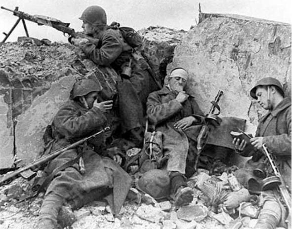Żołnierze radzieccy na linii frontu. Operacja Rzhev-Vyazemsky, styczeń 1942. Pisarz pierwszej linii N. Nikulin: « W przeciwnym razie nie moglibyśmy i nie moglibyśmy. Czytałem gdzieś, że angielski wywiad trenuje swoich agentów od dziesięcioleci. Są uczeni w najlepszych uczelniach, tworzą sportowców, intelektualistów, zdolnych do wszystkich ekspertów w swojej dziedzinie. Wtedy tacy agenci zajmują się sprawami globalnymi. W krajach azjatyckich zadanie to jest udzielane tysiącom lub dziesięciu tysiącom, pośpiesznie wyszkolonym ludziom w nadziei, że nawet jeśli prawie każdy zawiedzie i zostanie zniszczony, przynajmniej jeden wypełni swoją misję. Nie ma tu ani czasu, ani środków na szkolenia, ani doświadczonych nauczycieli. Wszystko odbywa się w pośpiechu nie mieli czasu wcześniej, nie myśleli, a nawet robili dużo, ale nie tak. Wszystko odbywa się grawitacją, intuicją, masą, liczbą. To drugi sposób, w jaki walczyliśmy. W 1942 r. Nie było alternatywy. Mądry Mistrz na Kremlu zrozumiał wszystko doskonale, wiedział i tłumiąc wszystkich z żelazną wolą, rozkazał: «Atak!» I zaatakowaliśmy, zaatakowaliśmy, zaatakowaliśmy A góry zwłok w pobliżu Pogosti, Newski Pyatachkow, bezimienne wyrosły, rosły, rosły. Czyli przygotowywanie przyszłego zwycięstwa. Gdyby Niemcy wypełnili naszą kwaterę szpiegami i sabotażystami, gdyby doszło do masowej zdrady, a wrogowie opracowali szczegółowy plan upadku naszej armii, nie osiągnęliby efektu, który był wynikiem idiotyzmu, otępienia i nieodpowiedzialności żołnierzy