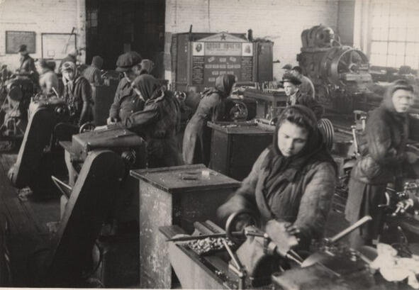 Nowe fabryki zbudowane na Syberii i poza Uralem są czasem wyrównanymi obszarami ziemnymi, bez ścian i dachów, z rzędami maszyn, na których produkowane są produkty wojskowe. Przeważnie pracują tu kobiety i młodzież.
