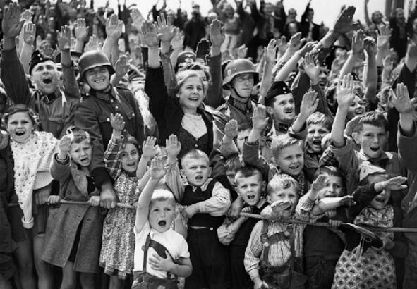 Niemieckie dzieci i żołnierze witają sukces nazistowskich Niemiec w 1940 roku