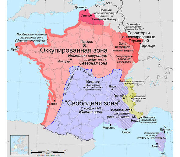 Okupacja Francji, Niemiec i Włoch, 1940 r. Główna część francuskiej floty, utrzymująca wysoki stopień skuteczności bojowej, znajduje się w Tulonie. Miejscowość wypoczynkowa Vichy staje się stolicą rządu