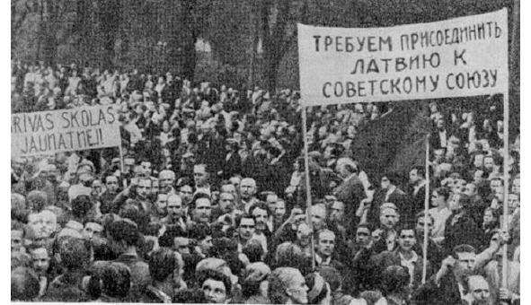 W październiku 1940 r. Związek Radziecki zaproponował Estonii, Łotwie i Litwie, zgodnie z umową o wzajemnej pomocy, umieszczenie na ich terytorium kontyngentu wojskowego 25 000 ludzi, w celu ochrony przed Niemcami. Jest już jasne, że Armia Czerwona jest skłonna osiągnąć swoje cele, pomimo straty. Dwa tygodnie później rządy tych krajów są oskarżane o spiskowanie z Niemcami (co częściowo jest prawdą), represjonowanie cudzoziemców i przemieszczanie się. Latem 1940 r., Zgodnie z wynikami powszechnego głosowania, republiki tworzą rządy komunistyczne i przyjmują Deklarację wjazdu do Związku Radzieckiego. Decyzje te są natychmiast zatwierdzane przez Radę Najwyższą ZSRR. Według dokumentów NKWD z 17 czerwca 1941 r. Na Litwie uwięziono 5 663 osób, głównie policjantów i «klasycznych kapitalistów», 10 186 osób zostało przesiedlonych, 5 624 i 9 547 Łotwy, odpowiednio 3 179 i 5 979 Estonii. Prezydent Litwy Antanas Smyatona emigruje do Niemiec, a następnie do Szwajcarii i Stanów Zjednoczonych. Jego estoński kolega Konstantin Päts jest deportowany wraz z rodziną na Syberię, dostaje 25 lat obozów, jest więziony w więziennej klinice psychiatrycznej od 1942 r., Umiera tam w 1956 r. wraz z pro-sowieckim rządem, aw szczególności publikuje «Ustawę o zwalczaniu szkodników». Później zaczyna zdawać sobie sprawę z sytuacji i prosi Kreml o zgodę na podróż do Szwajcarii. W rezultacie wchodzi do obozu NKWD w pobliżu Krasnowodska (Turkmenistan), gdzie w 1942 roku umiera. Fotografia jest demonstracją ludności Łotwy za przystąpienie do Związku Radzieckiego. Czerwiec 1940 r