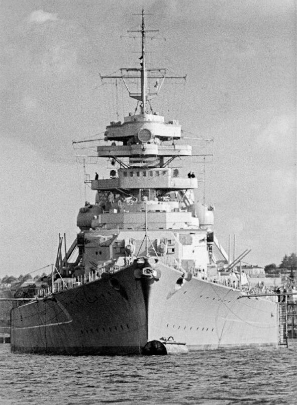 Niemiecki pancernik «Bismarck», największy statek swoich czasów. Krawężnik wypornościowy 50 000 ton (dwa razy wyższy niż lotniskowiec), długość 251 metrów, szerokość 36 metrów, zanurzenie 10 metrów Maksymalna prędkość 55 km. godzin, autonomiczny zasięg nawigacji 17 000 km. Główne uzbrojenie to osiem 380 mm. pistolety w czterech wieżach.