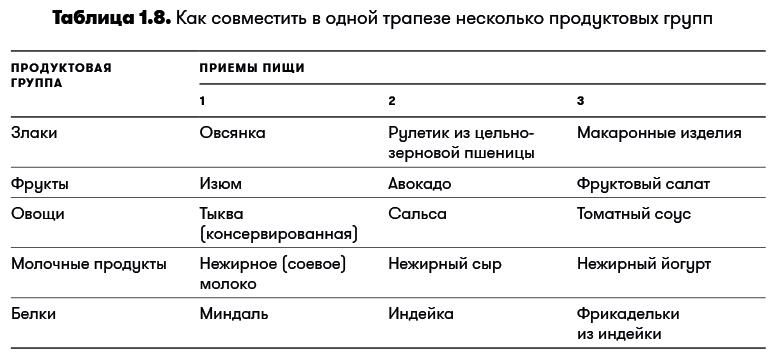 Теперь, прочитав эту главу, вы знаете, какая еда самая полезная. Вся хитрость в том, чтобы объединить лучшие продукты в полноценные, качественные приемы пищи и перекусы. Рекомендую каждый раз выбирать хотя бы три из пяти групп продуктов. В таблице 1.8 представлено несколько вариантов, которые, возможно, придутся вам по вкусу.
