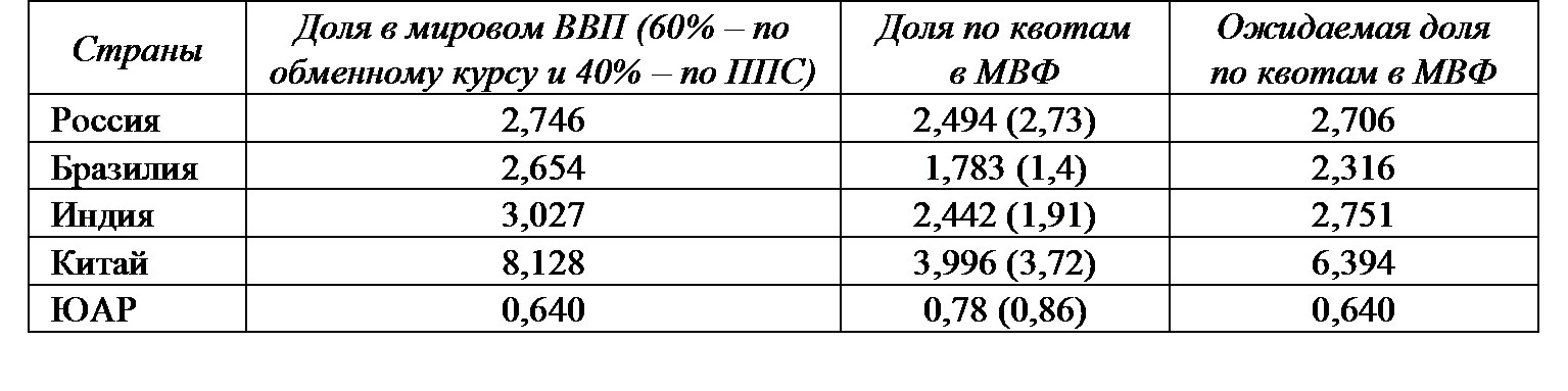 В то же время поддержка других стран БРИКС в случае их консолидированной позиции по вопросам реформирования системы квот может не только содействовать неформальному увеличению переговорной силы России в МВФ и других международных организациях. Кроме того, это может способствовать благоприятным для России решениям в области взаимного сотрудничества.