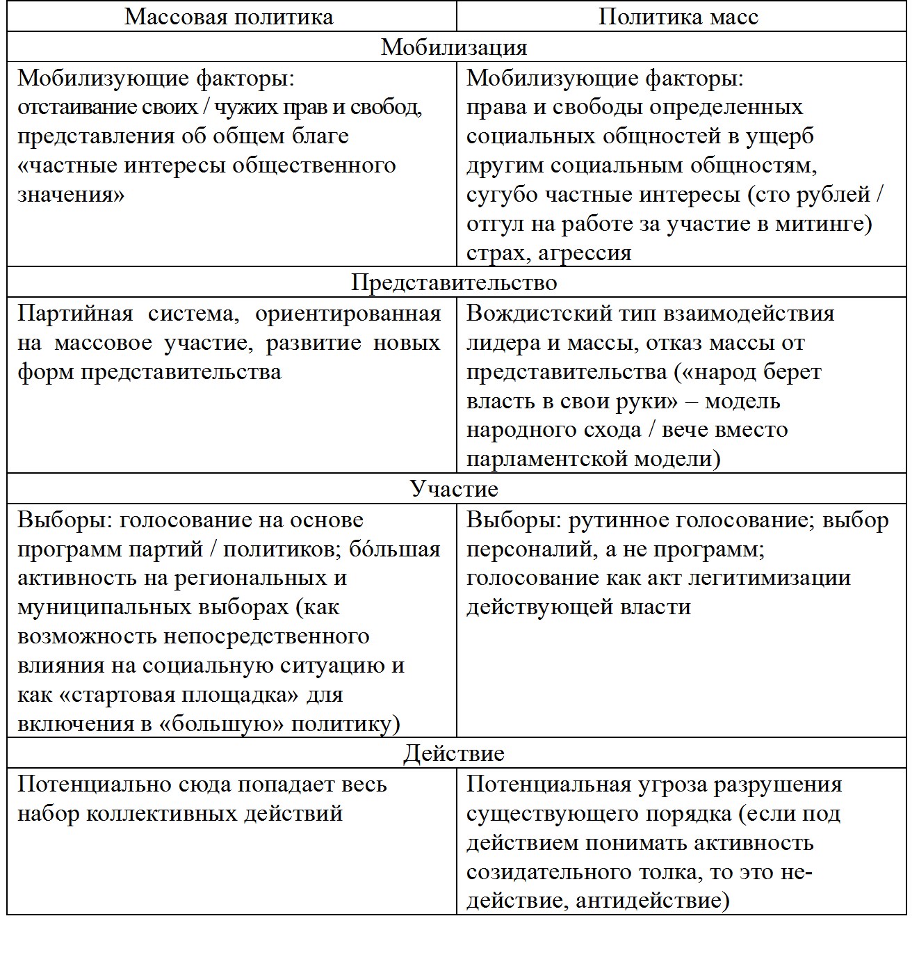 Анализ того, каким содержанием наполняется каждый из этих элементов, позволяет дифференцировать массовую политику и политику масс. Если массовая политика – это «субстрат» демократического политического процесса, то первоочередным критерием для ее определения является ориентация включающихся в политику индивидов на реализацию прав и свобод (или борьбу за их предоставление / расширение / применение). Отталкиваясь от этого критерия, мы можем выделить ряд признаков (как формальных, так и сущностных), характеризующих мобилизацию, представительство, участие и действие в массовой политике, и противопоставить им признаки, присущие политике масс (см. табл. 2).