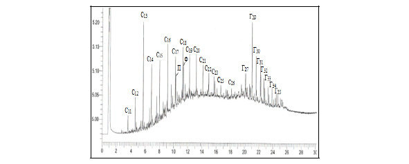 Рис. 2. Хроматограмма битума из поверхностных отложений Шугуровского месторождения (тип Б1)