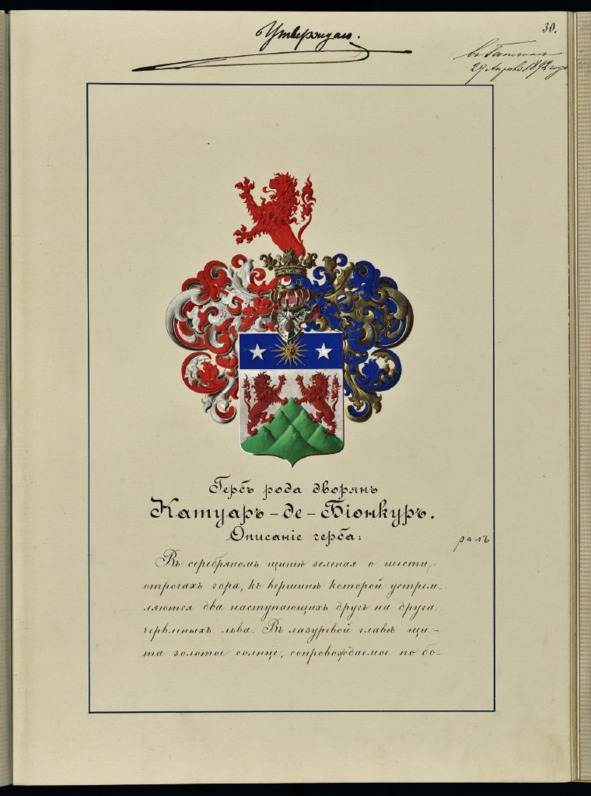 Герб рода дворян Катуар-де-Бионкур внесен в Часть 15 Общего гербовника дворянских родов Всероссийской империи, стр. 30