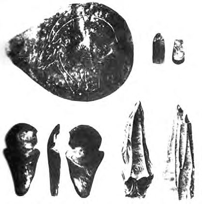 Рис. 1.23. Масляная лампа. Камень. Ла Мут. Департамент Дордонь, Франция. Масляная лампа. Камень. Леспюг. Департамент Верхняя Гаронна, Франция. Заостренные камни, применявшиеся, вероятно, для процарапывания рисунков. Рок де Сер. Департамент Шаранта, Франция. [1]