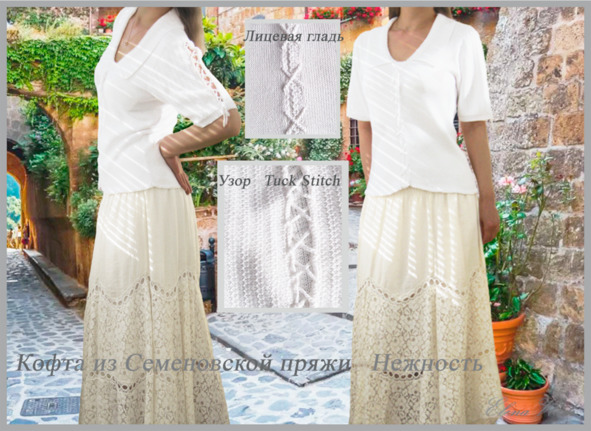 Воротник: набрать пряжей на иглы 170 п. (по 85 п. по обе стороны от центра О (85-0-85)). Связать 5 р. английской резинкой. Поставить плотность вязания на цифру 6 и выполнить 1 р. лиц. п., вставить перфокарту узора Tuck Stitch (перфокарта 4-А, узор №19). Включить счетчик рядов, вязать узором 57 р., затем связать 5 р. лиц. п., 6-й р. связать на плотности 9 и закрыть все п. По краю основания воротника (между лицевой гладью и узором) набрать п. на спицы (для 2-го основания воротника). Связать лицевой гладью также 5 р., 6-й р. связать и закрыть все п.