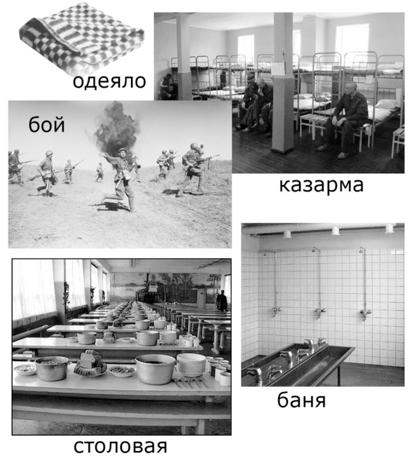 – Левой, левой! – А жену зачем привезли? У меня три сотни бойцов. Общая (common) казарма, общая баня. Но товарищ командир… Дам сопровождающих (escort), три дня отпуска. Отвезете в город.