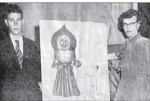 Двое очевидцев «флэтвудского монстра» с картиной, изображающей увиденное