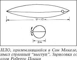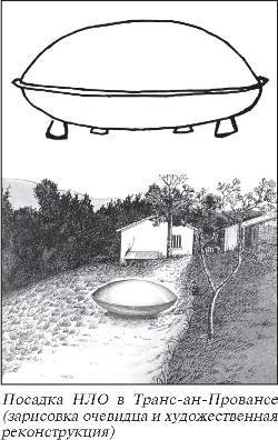 «Мое внимание привлек несильный звук, – что-то наподобие слабого свиста. Я повернулся и увидел в воздухе объект где-то на высоте сосны на границе участка. Он, не вращаясь, с легким свистом снижался. Я не видел никакого пламени под ним или вокруг. Пока объект снижался, я подошел ближе, хорошо разглядев аппарат. С верхней террасы я видел, что он совершил посадку и почти тут же взлетел. Он, по-прежнему издавая свист, поднялся выше деревьев и очень быстро улетел на северо-восток в сторону леса. Когда аппарат взлетал, я заметил в дне четыре отверстия, откуда, однако, не шел дым или пламя. Он поднял немного пыли, когда отрывался от земли. В этот момент я находился примерно в 30 метрах от места посадки. Потом я подошел и увидел круглый след, диаметром порядка двух метров. В ряде мест по его окружности находились некие следы или отпечатки.