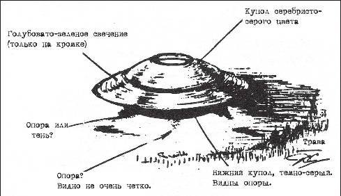 «Он имел диаметр порядка 6 метров, я оцениваю его высоту в 2,7 м, включая нечто вроде ножек, торчащих из днища. Край его излучал зеленовато-голубой свет, а верхняя и нижняя половины – тусклый серебристо-серый цвет. Полость сверху могла на самом деле быть стеклянным куполом».