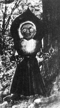 Собака Лемона ощетинилась и затряслась, как в лихорадке, уставясь куда-то вбок. Лемон зажег фонарик и направил луч на кусты, куда смотрела собака. Кэтлин вскрикнула от ужаса: там находилось что-то живое! Свет фонарика выхватил из мглы голову и плечи существа трехметрового роста. На голове у незнакомца было надето какое-то подобие капюшона. Туловище отражало свет фонарика примерно так, как его отражала бы струящаяся на ветру шелковая материя.