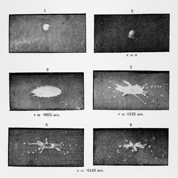 Он озарял свою лабораторию мощными миллисекундными вспышками и сосредоточенно изучал каждый этап столкновения капли жидкости с поверхностью по скрытому изображению, оставляемому на его сетчатке. Его целью было создание «исторической» покадровой последовательности изображений, разделенных тысячными долями секунды (ил. 0.1). Начиная с 1875 года британскому физику Артуру Уортингтону мало-помалу удалось выстроить в ряд ключевые моменты, разложив сложный процесс течения жидкости в систематическую визуальную классификацию. Иногда ободок волны, поднимаемой каплей, был близок к тому, чтобы принять форму пузыря; в иных обстоятельствах возвратная волна выбрасывала высоко в воздух струю жидкости. Края и спицы, пузыри и струи – уортингтоновский каталог изображений капель положил начало разделу гидродинамики, получившему продолжение более столетия спустя. Для самого Уортингтона предметом его исследований всегда была, как он постоянно повторял, физическая система, примечательная красотой своей совершенной симметрии.